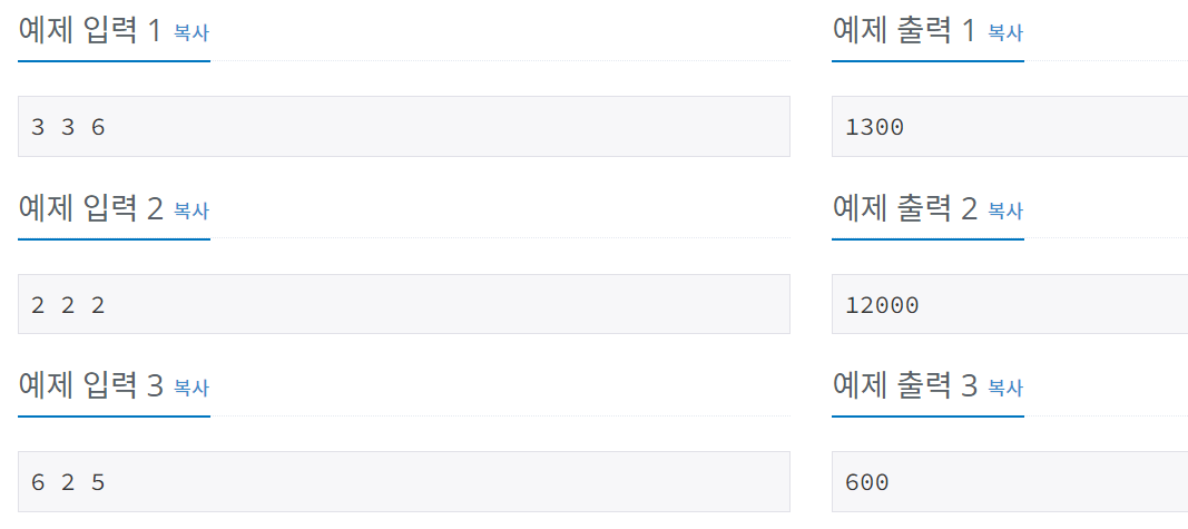 첫째 줄에 3개의 눈이 빈칸을 사이에 두고 각각 주어진다.